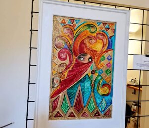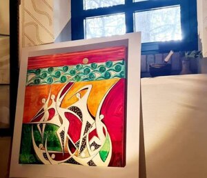 La figura centrale –   femminile, accogliente,  potente – è l’Anima che ci abita. È colei che custodisce, hce genera, che accoglie la luce e l’ombra, il dolore e la rinascita. Le linee che la avvolgono sono movimenti interiori: pulsazioni, ricordi, intuizioni. Il corpo è blu come il profondo, come la notte, come l’inizio. Il cuore è un sole ardente, forse un trauma trasformato in stella, forse un amore che ha trovato la via del centro.